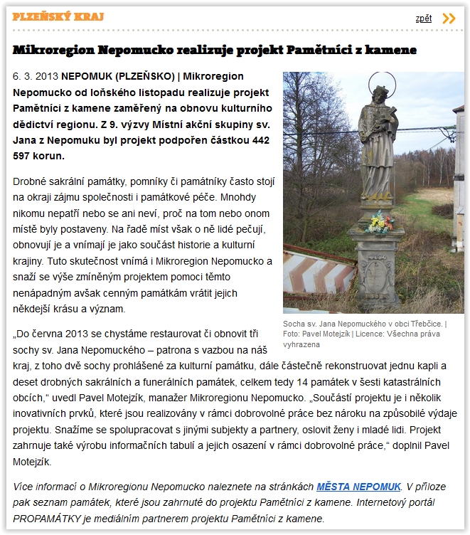 Mikroregion Nepomucko realizuje projekt Pamětníci z kamene 2013